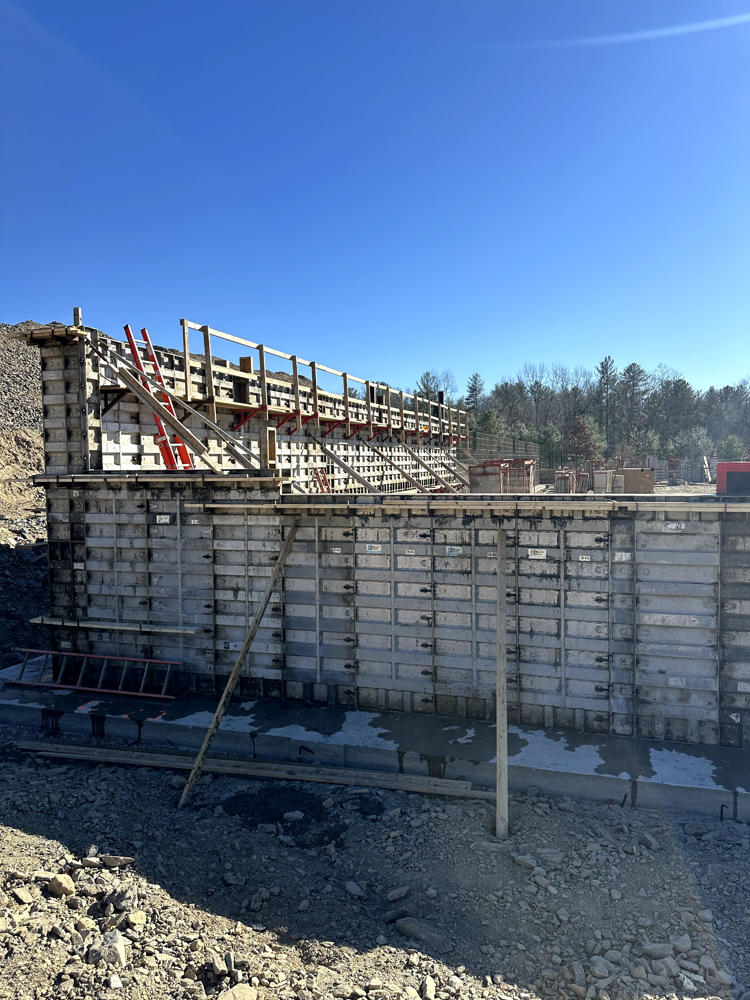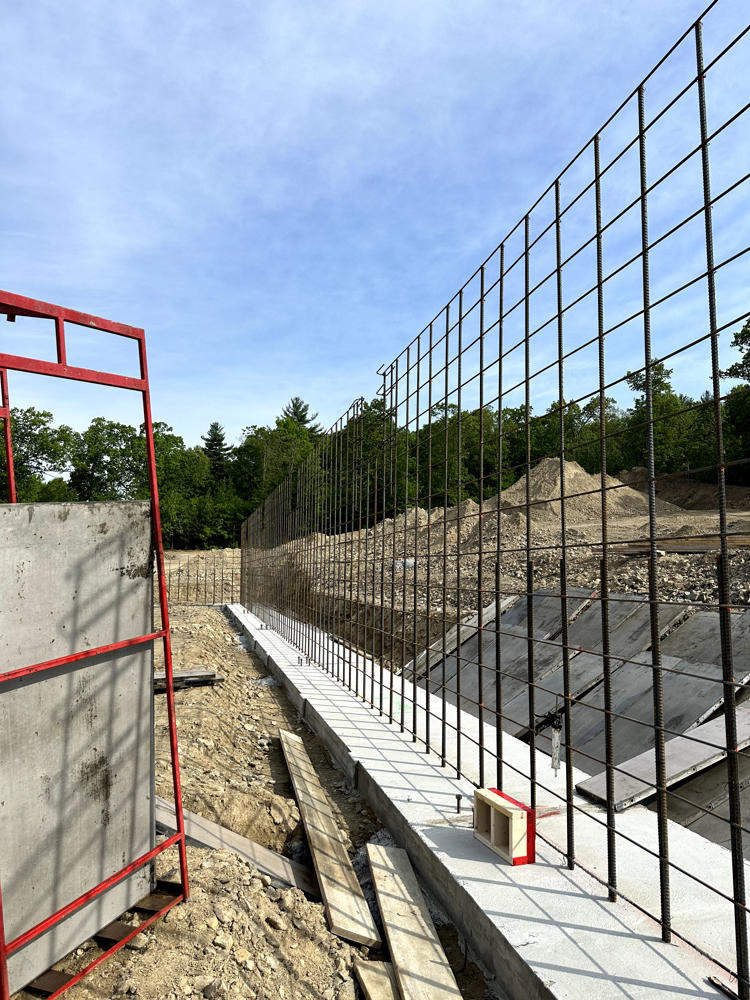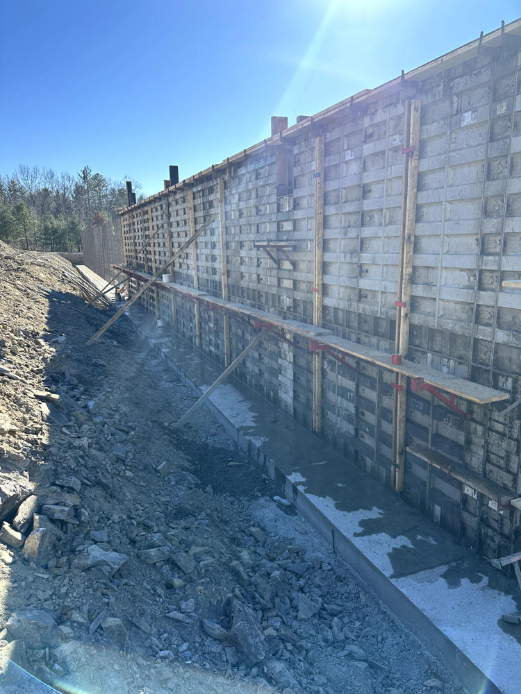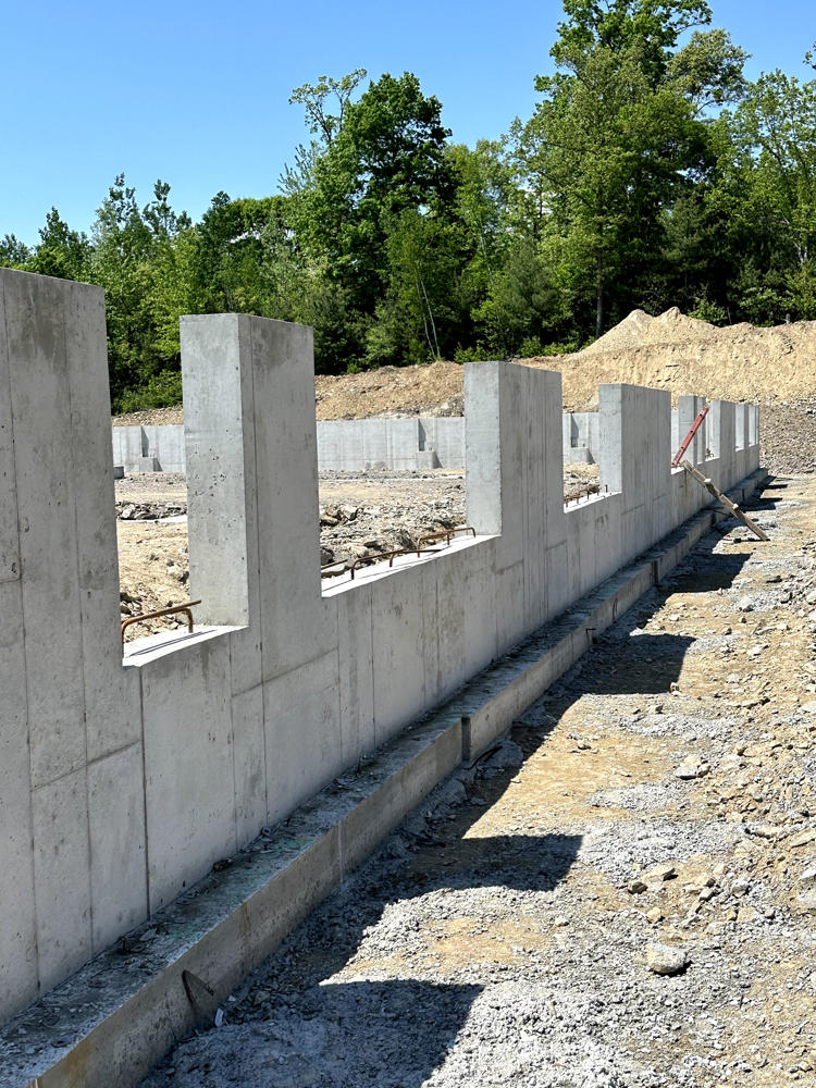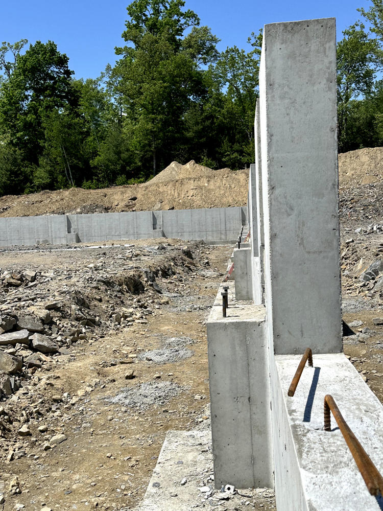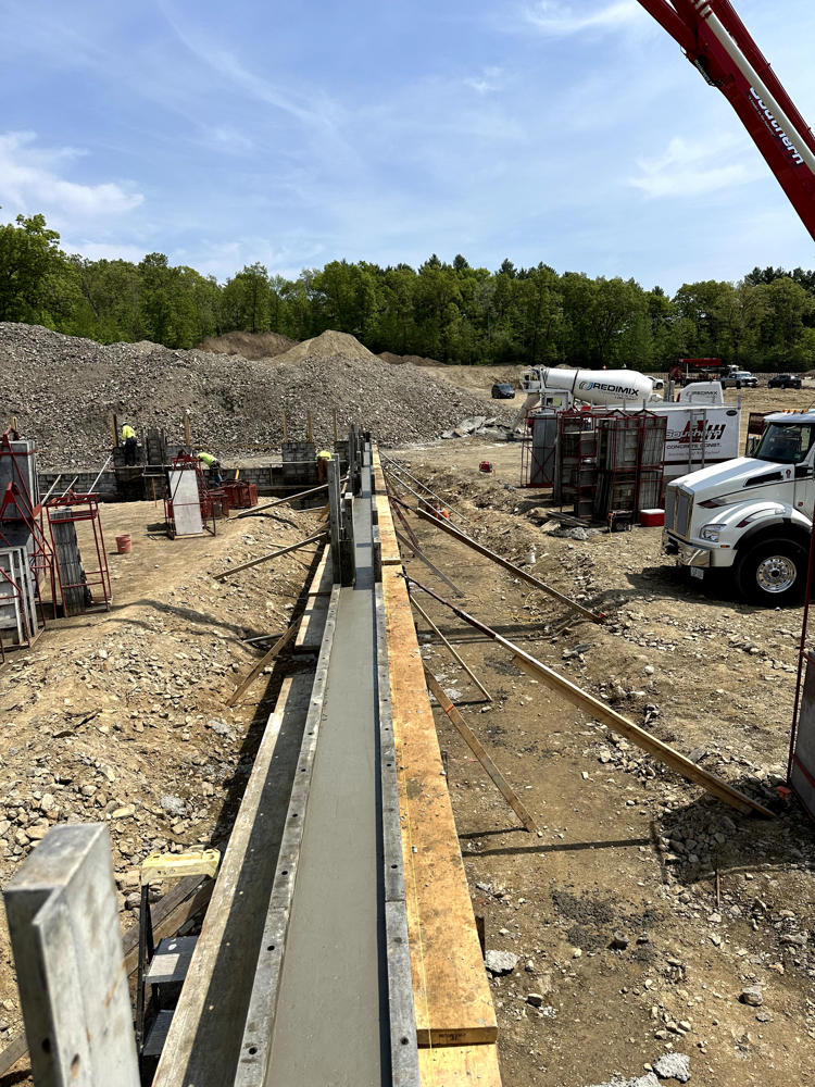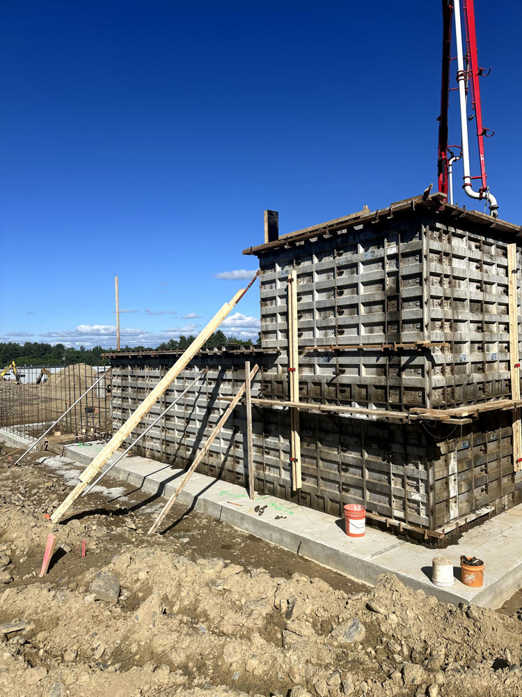 Foundation walls ranged from 15’ high to 5’ with over 35 ton of rebar installed and set over 200 anchor bolt settings for the steel structure. Interior slabs placed at a depth of 8” with fiber for the heavy loading.